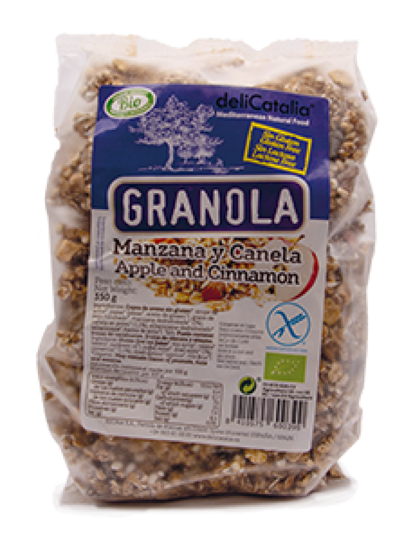 Ingredientes: Copos de avena sin gluten, sirope de arroz, pasas (pasas, aceite de girasol),grano de mijo hinchado, manzana deshidratada(3%), canela en polvo(1.8%),albaricoque deshidratado(alaricoque, harina de arroz).Eco.