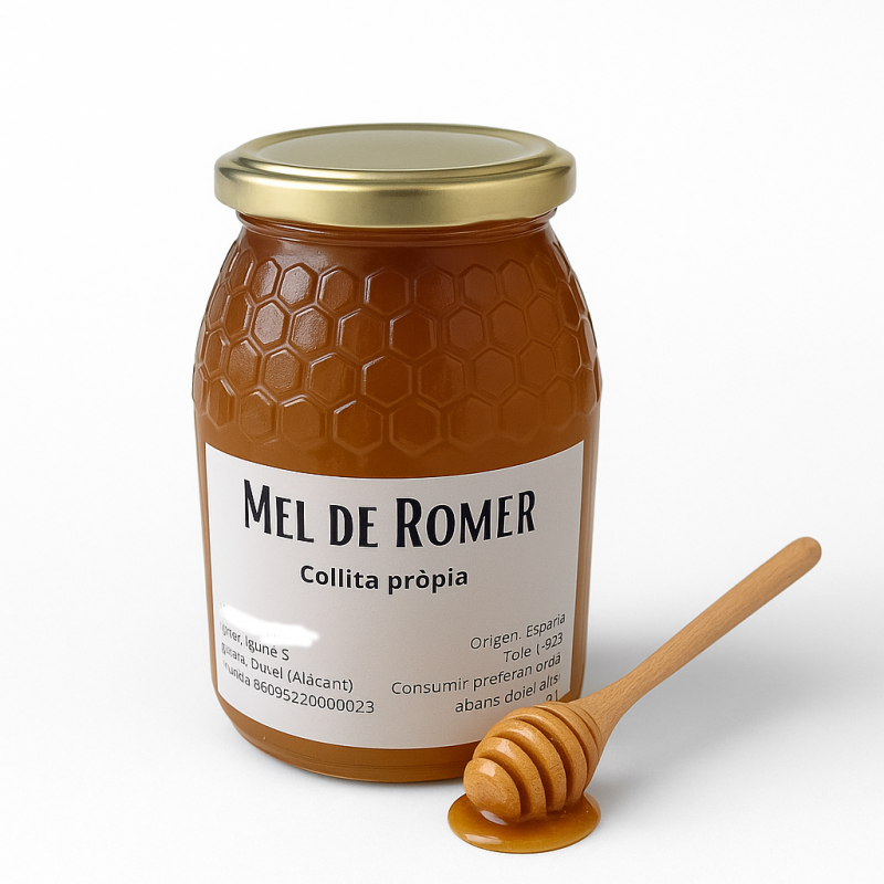 La miel de romero es miel pura de abeja. Es decir, no contiene aditivos, conservantes ni colorantes. Sólo contiene 100% miel de abeja pura. Además, es una de las más usadas en la elaboración del turrón