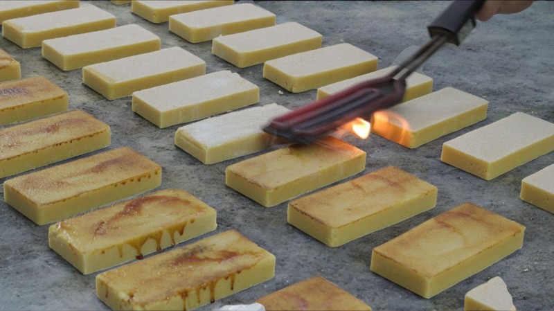 Voici une vidéo de comment le sucre est brûlé pour faire le jaune grillé :